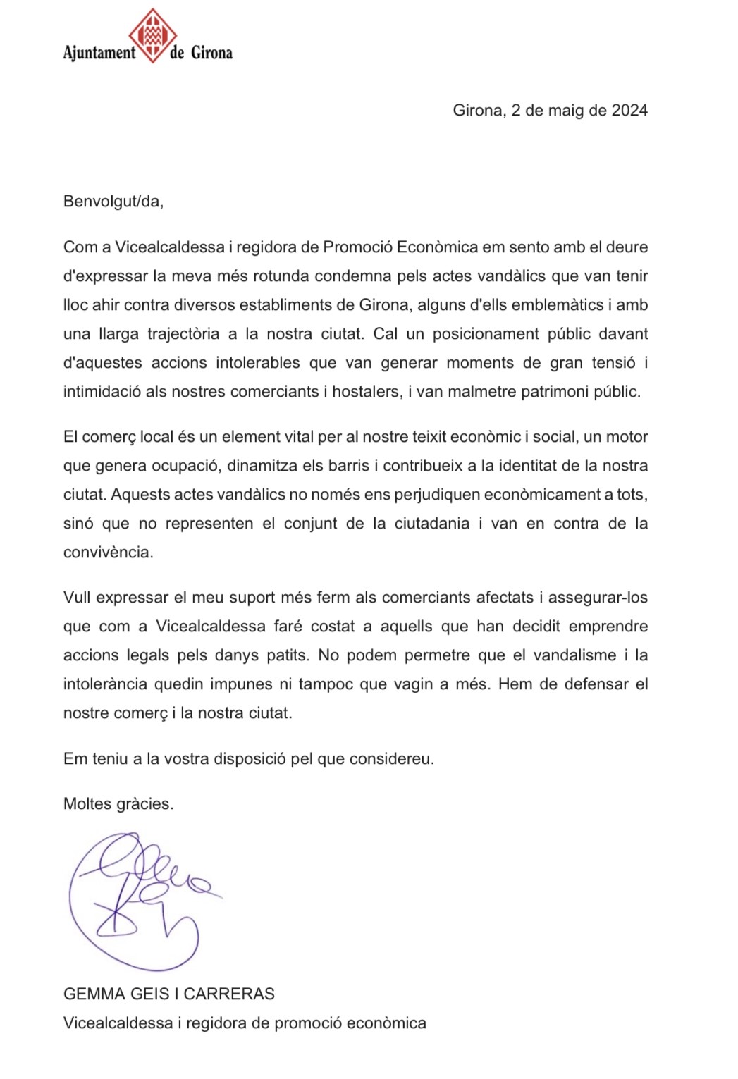 La vicealcaldessa Gemma Geis exposa en una carta adreçada al sector el suport i la condenma sense fisures del grup municipal de Junts.